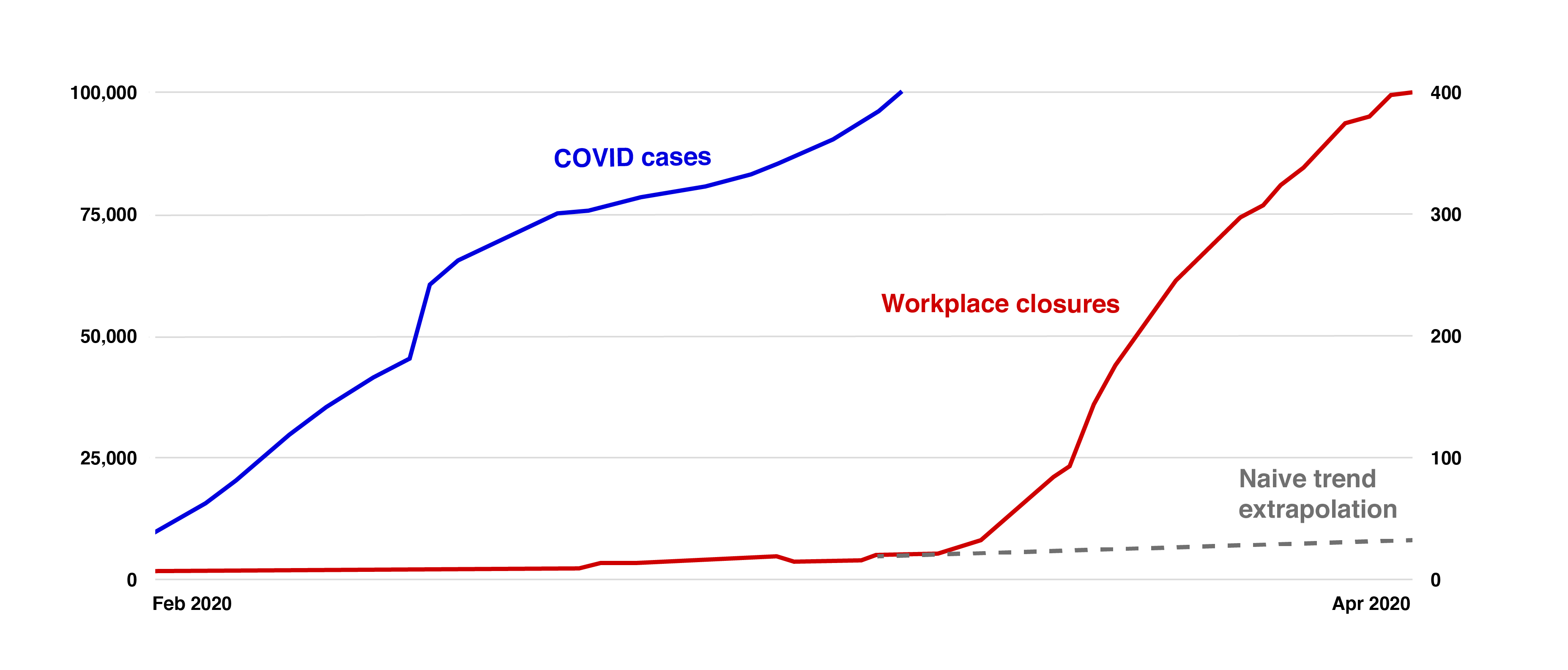 - When COVID-19 first emerged, a lot of people had trouble taking it seriously because it didn't feel as though we were "trending toward" or "headed for" a world full of overflowing hospitals, office and school closures, etc. At the time (say, January 2020), there were a relatively small number of cases, an even smaller number of deaths, and no qualitative sense of a global emergency. The only thing alarming about COVID-19, at first, was that case counts were growing at a fast exponential rate (though the overall number of cases was still small). But it was possible to extrapolate from the fast growth in case counts to a risk of a global emergency, and some people did. (And some didn't.)