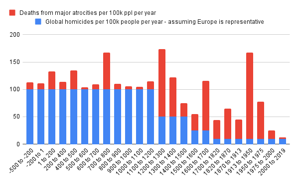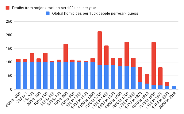 Since the mid-20th century, deaths from wars and atrocities have been much lower - though it's hard to make too much of this, because in general, wars and atrocities seem very volatile, with massive death tolls sometimes occurring after centuries of relative peace. Furthermore, as argued in Toby Ord's book The Precipice, there's a case to be made that today represents an all-time high in terms of risks that could decimate a significant fraction (or even all) of humanity. So maybe rather than declining violence, what we're seeing is a continued trend of more and more infrequent risks of larger and larger catastrophes.