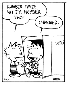 The Duplicator is portrayed in this series of comics. Its key feature is making an instant copy of a person: Calvin walks in, and two identical Calvins walk out.