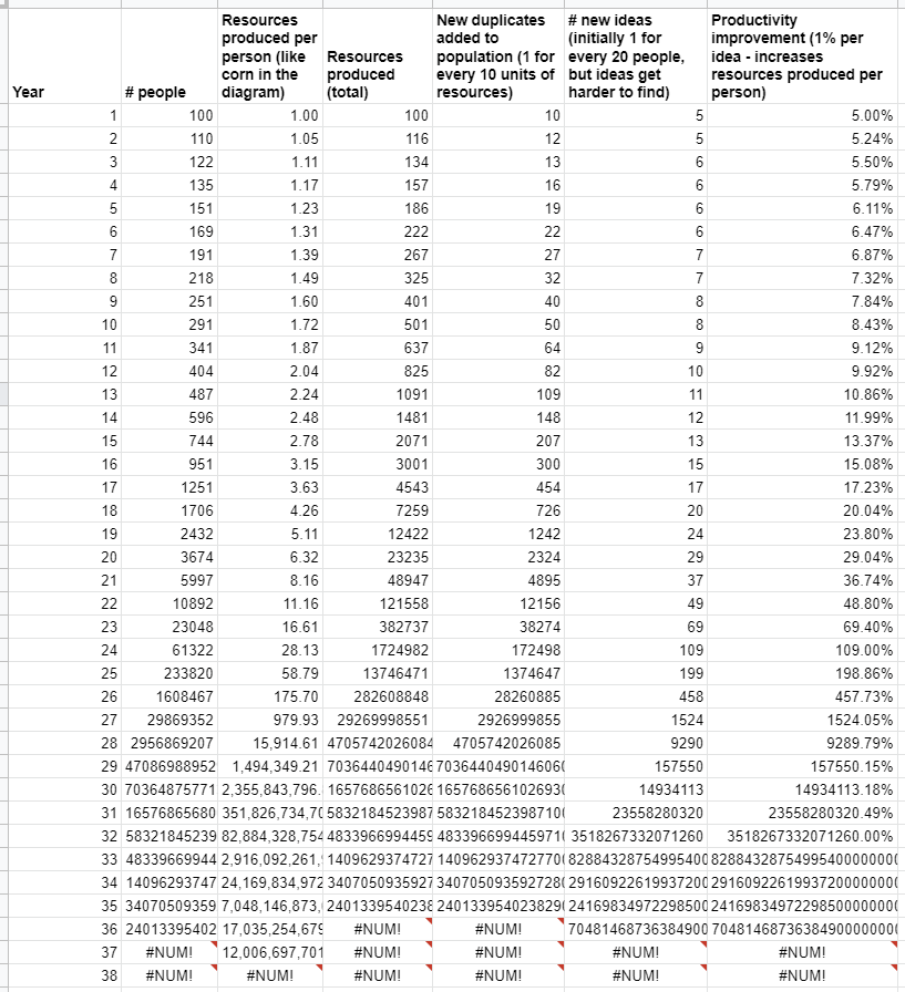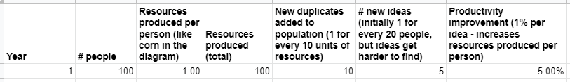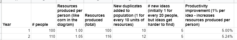 100 people produce 100 units of resources (1 per person). For every 10 units of resources, they're able to create 1 more duplicate (this is just capturing the idea that duplicates are "costly" to create). And the 100 people have 5 new ideas, leading to 5% productivity growth.