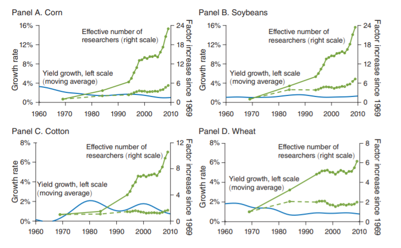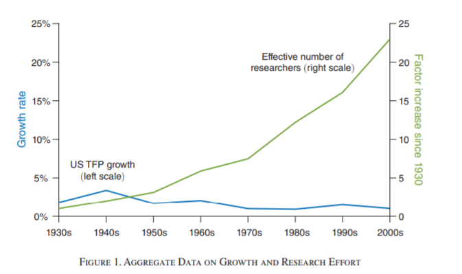 - The basic dynamic is that innovation in a given area is mostly a function of how many people are trying to innovate, but "ideas get harder to find" over time.