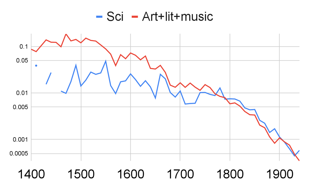 (It doesn't really matter exactly how the effective population estimate is done in this case - as shown above, per-capita "productivity" in art and science was pretty constant over this time, so any adjustment for growing health/nutrition/education/urbanization will show a decline.)