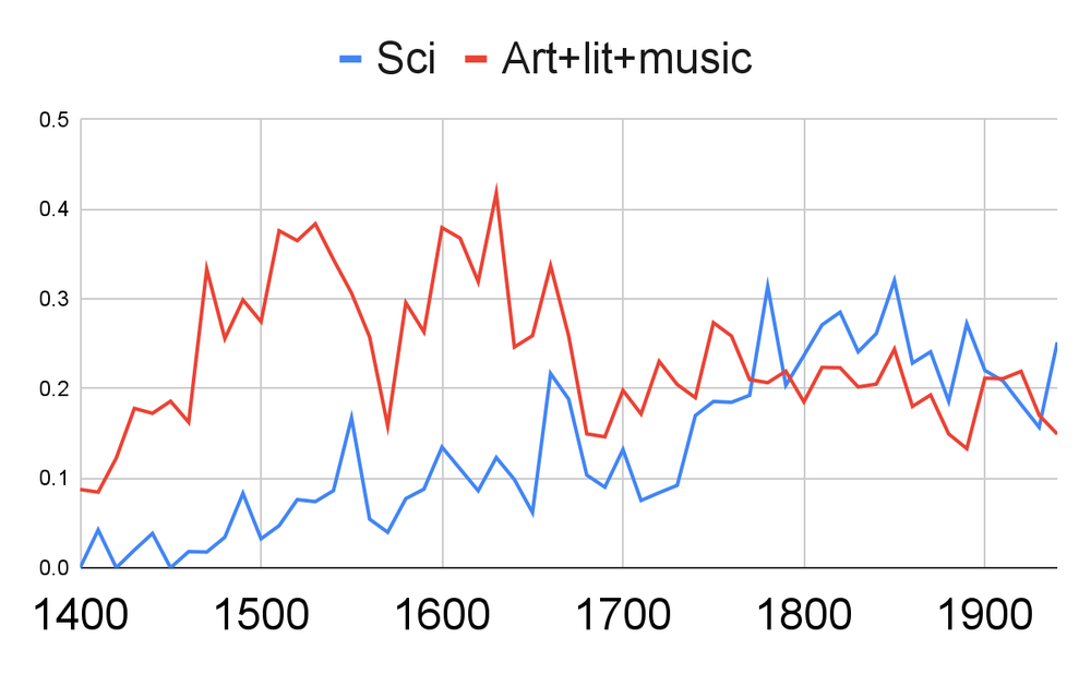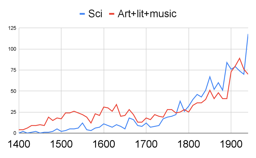 So here are the total number of acclaimed figures in science and art+lit+music, adjusted for my "effective population" estimate:
