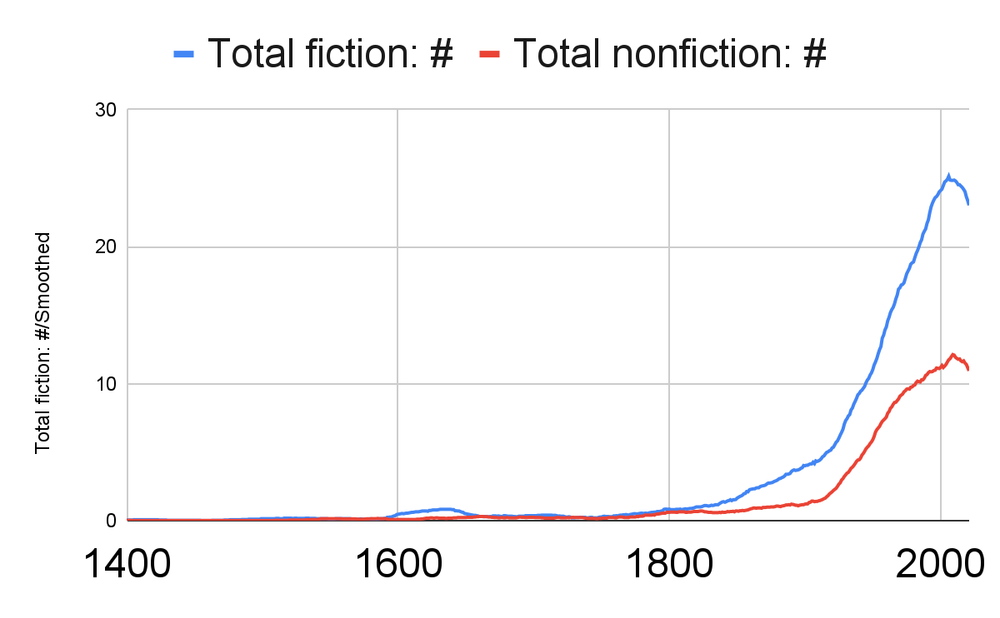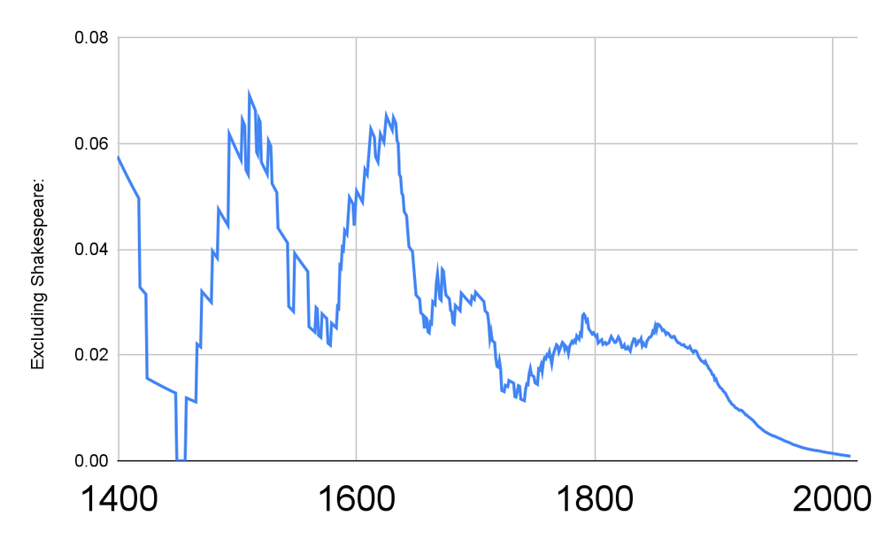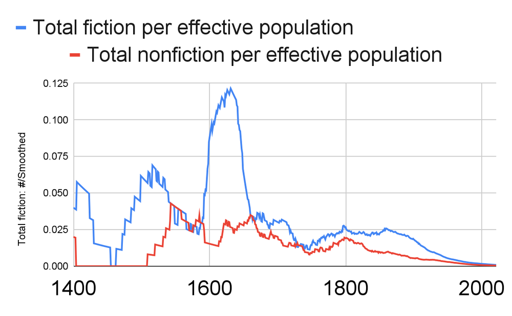 The big peak for fiction specifically around 1600 is heavily driven by Shakespeare - here's the same data for fiction, but excluding him:
