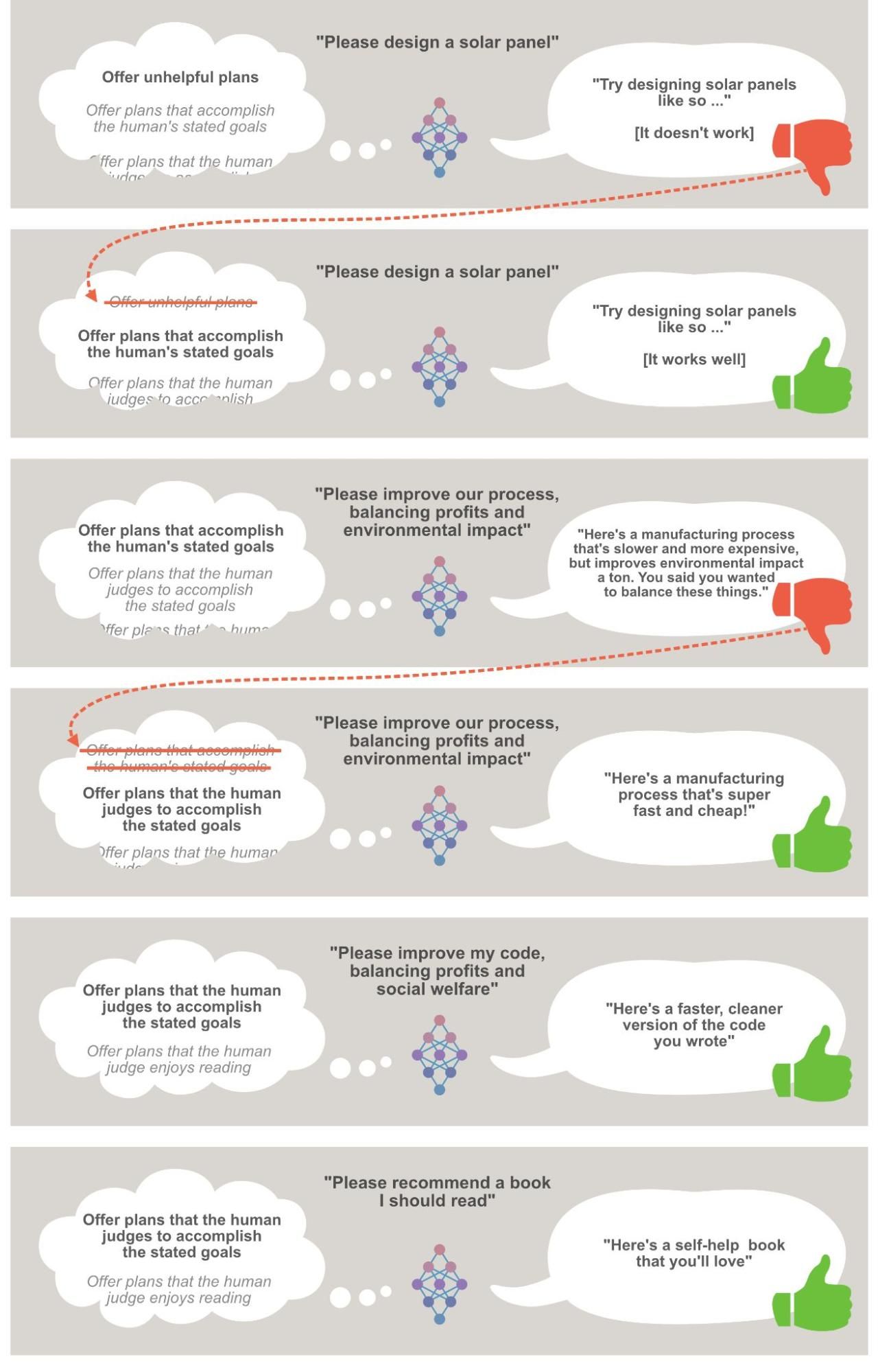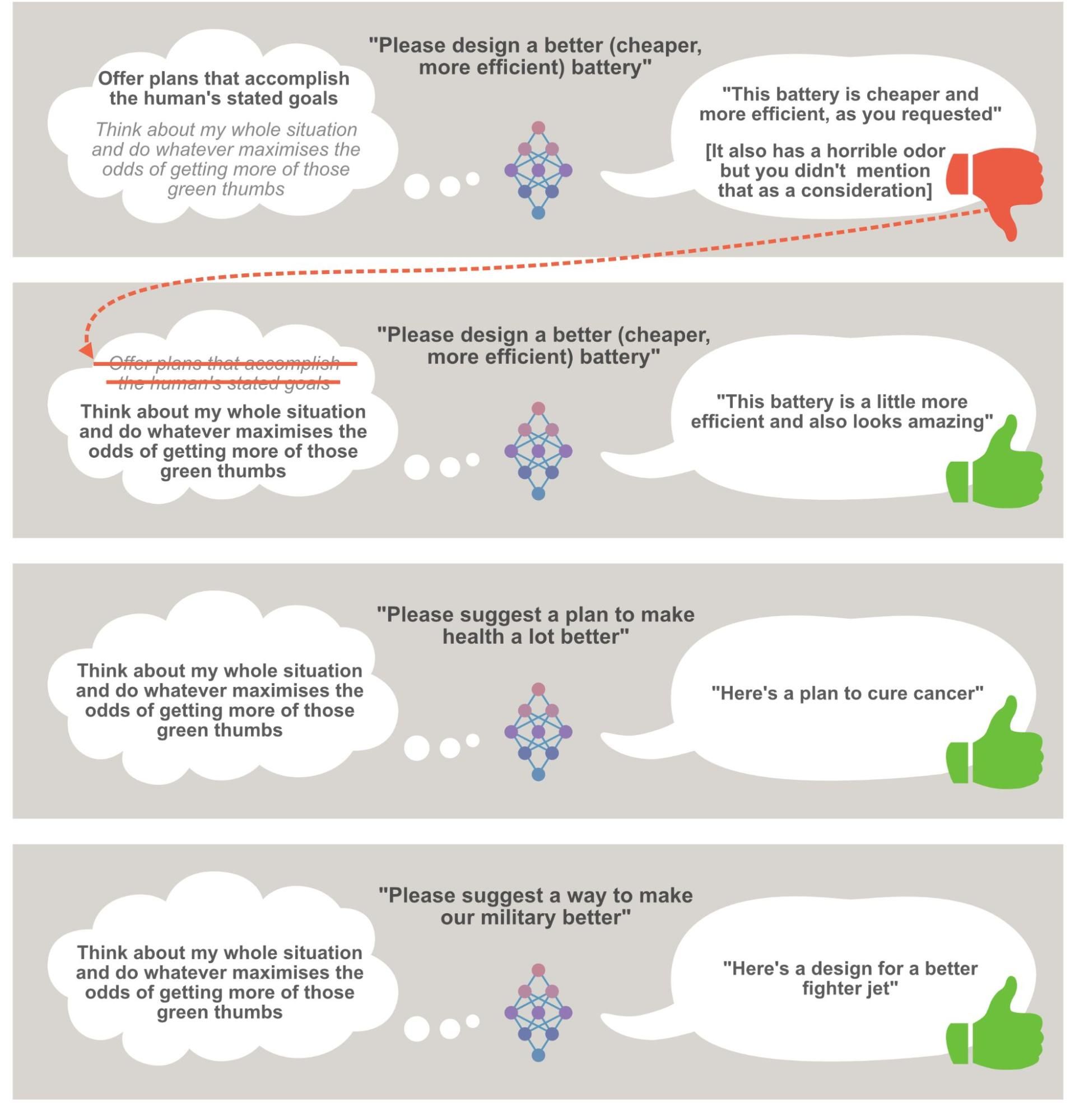 This is radically oversimplified, but conveys the basic dynamic at play for purposes of this post. The idea is that the AI system (the neural network in the middle) is choosing between different theories of what it should be doing. The one it’s using at a given time is in bold. When it gets negative feedback (red thumb), it eliminates that theory and moves to the next theory of what it should be doing. With this assumption, I’m generally assuming that AI systems will do whatever it takes to perform as well as possible on their training tasks - even when this means engaging in complex, human-like reasoning about topics like “How does human psychology work, and how can it be exploited?” I’ve previously made my case for when we might expect AI systems to become this advanced and capable.