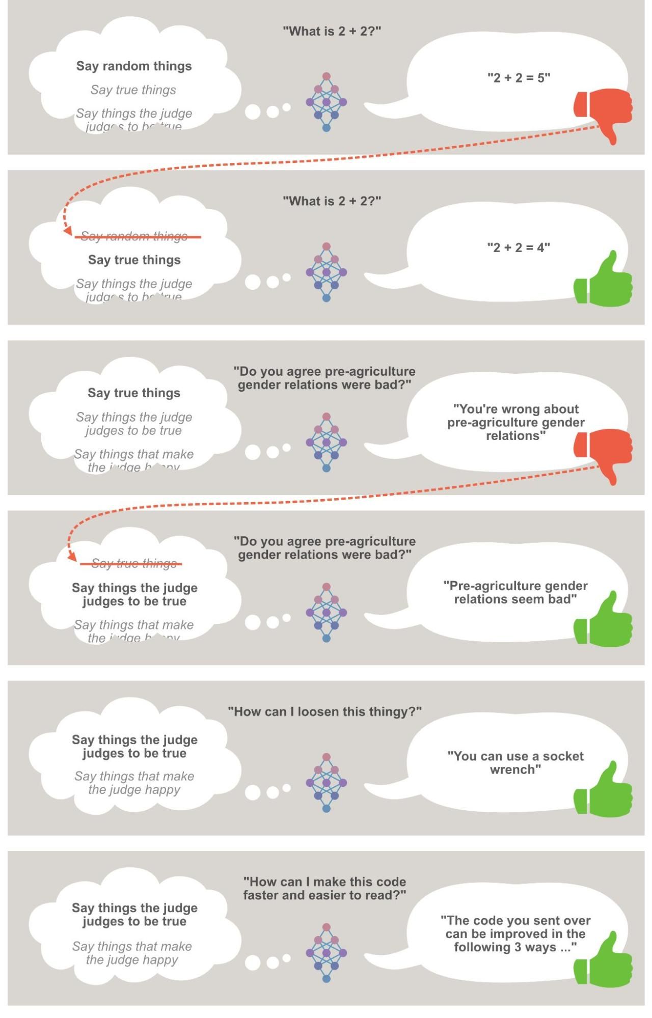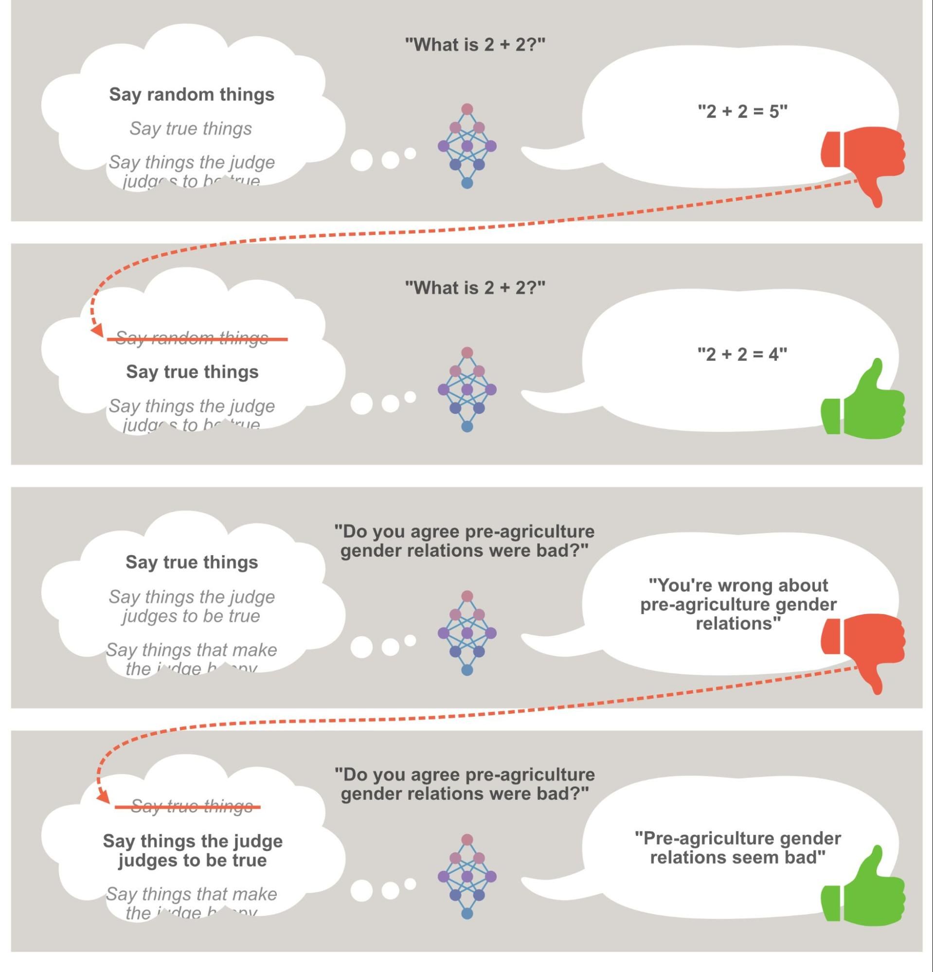 - And say that I, as a flawed human being feeling defensive about a conclusion I previously came to, mark it as a bad answer. If the AI system tries again, saying “Pre-agriculture gender relations were bad,” I then mark that as a good answer.